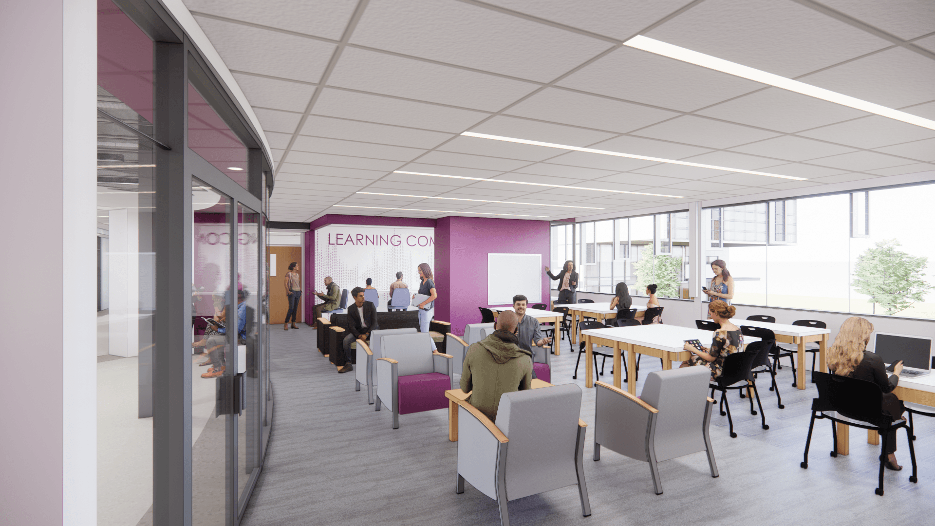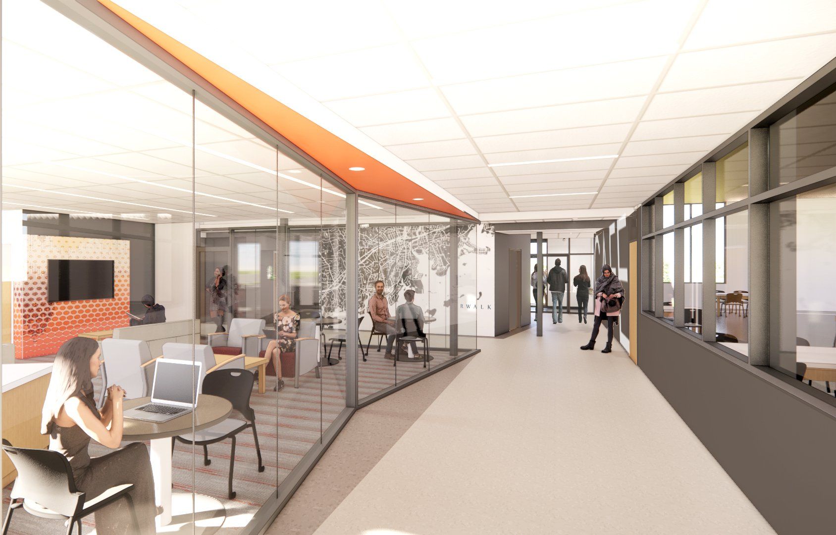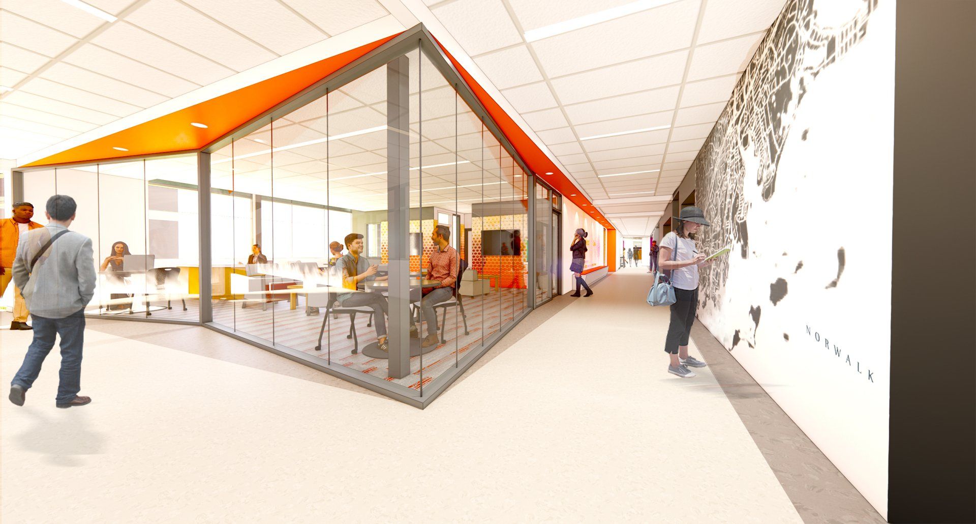 Tecton is currently working with the State of Connecticut and Norwalk Community College to transform the campus’s “B-Wing” into a fresh learning environment that elevates the student experience and is reflective of NCC’s diverse community. The refreshed facility incorporates trends in higher education and workplace design, including daylighting, personalization and adaptability, and aligns with local employer engagement programs. The biggest change can be seen in the transition from the 1966 building's double-loaded corridor layout to a flexible floor plan with adaptable learning spaces, casual study areas and a central Learning Commons to accommodate evolving educational approaches.