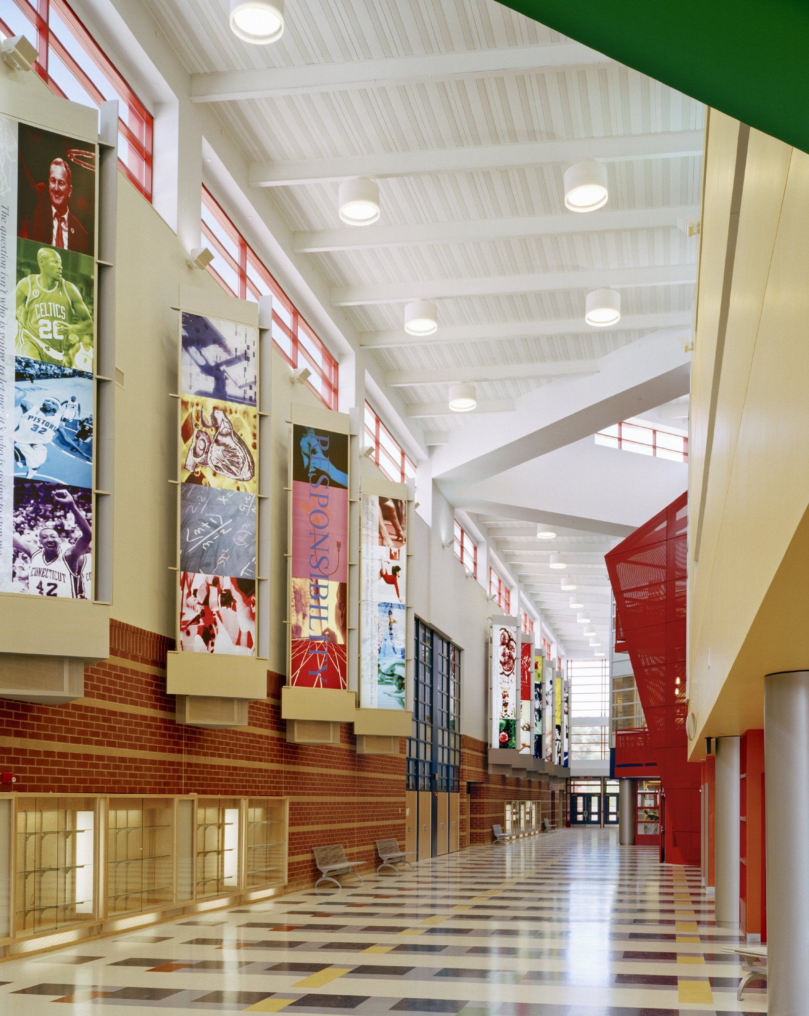 SMSA is a 750 student, 158,000 square foot magnet school for grades 7-12 in the historic Coltsville section of Hartford. The school’s academic program is centered around sports and related fields, including sports medicine, sports marketing and medical sciences. To support this specialized curriculum, the building includes a large, four court field house with climbing wall, fitness center, weight room, training facility, television studio, computerized graphic design studio and enhanced science lab facilities. The school also features a “Hall of Fame” concourse that celebrates prominent Hartford and Connecticut sports figures and teams, as well as leaders in the history of medical sciences.