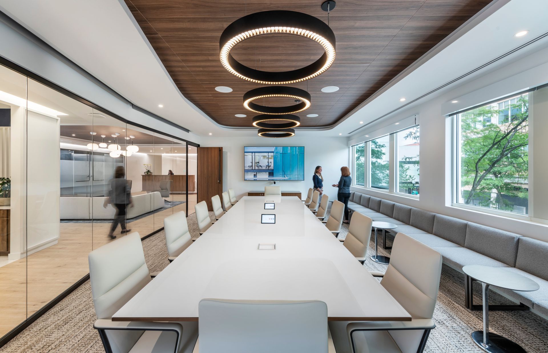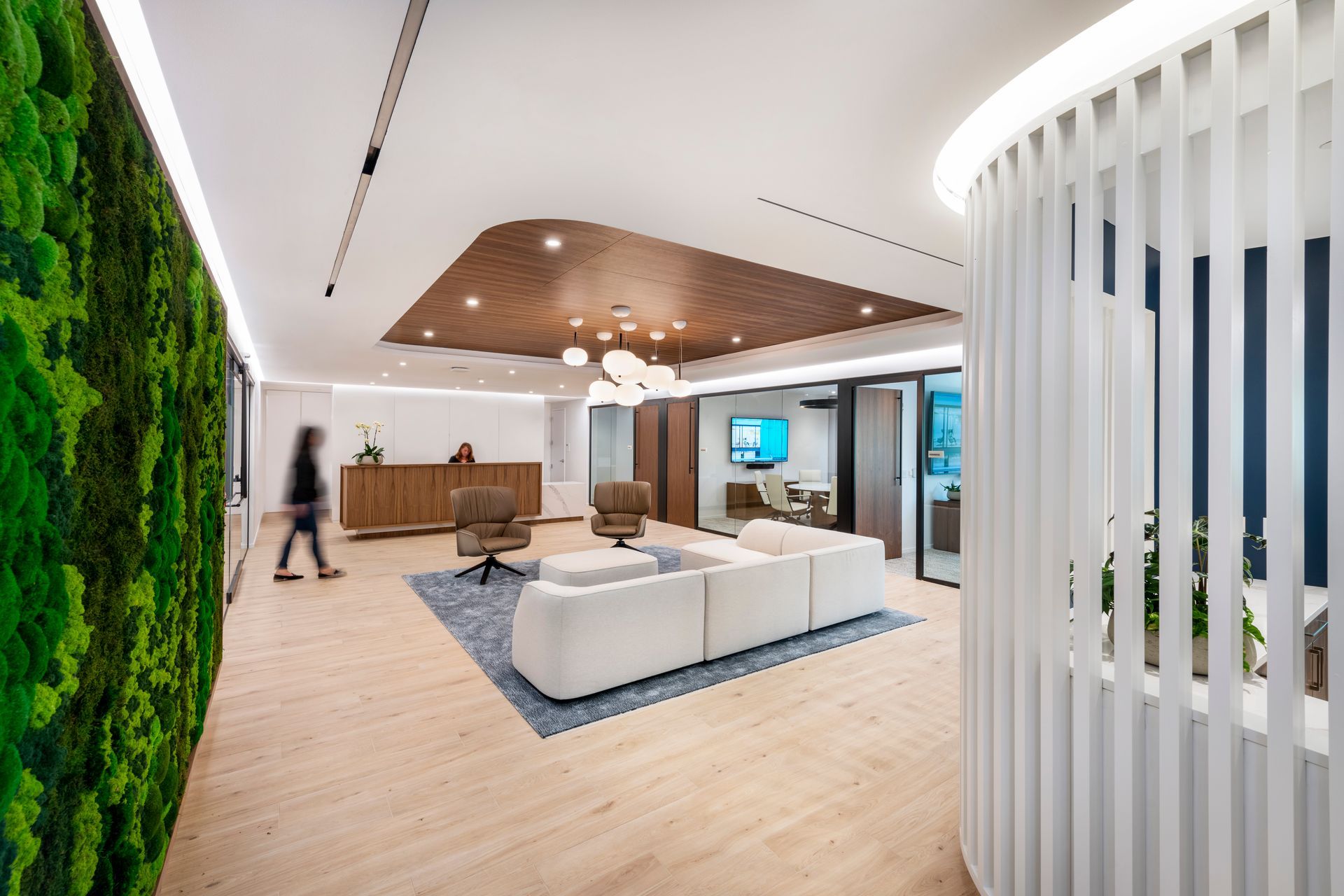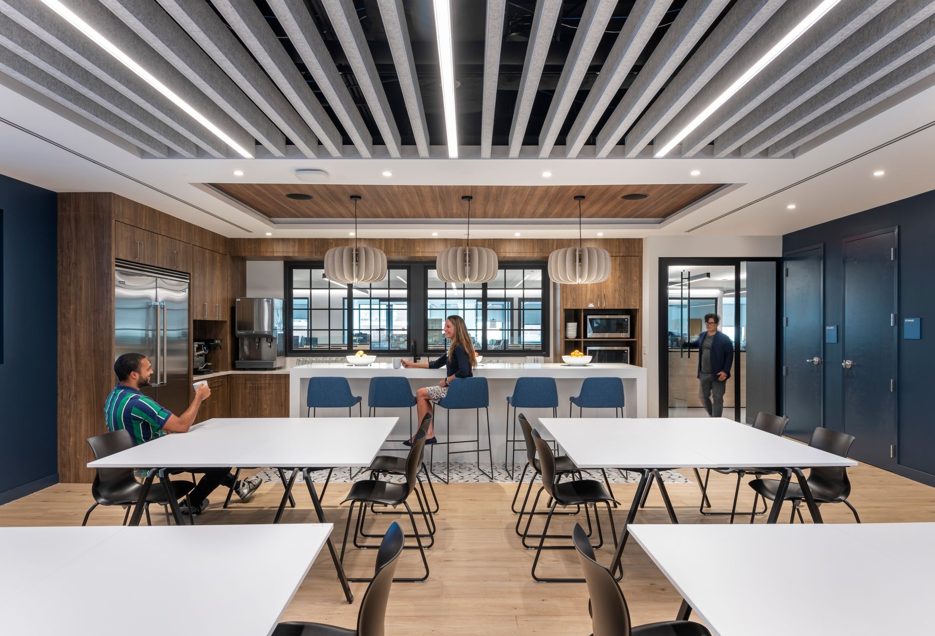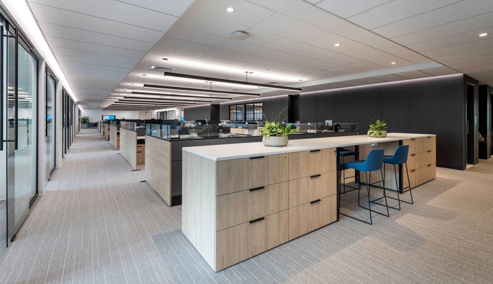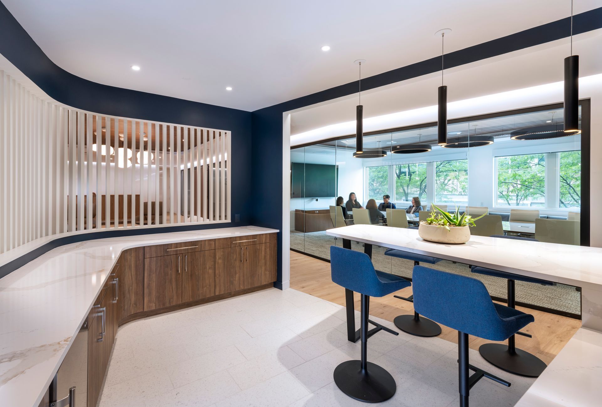 Our client, a global alternative investment manager, acquired a private equity firm and sought to relocate the company’s Simsbury office to better support growth and serve clients. With Tecton’s support, our client selected the second floor of a two-story building in West Hartford’s Blue Back Square, a distinct contrast to the company’s existing rural location. Tecton’s design exploration process delved into the tradition, culture and working style of the existing office and staff, while exploring new ways to maximize collaboration and efficiency. The new space includes a mix of open office and collaborative spaces, with abundant glass and private offices strategically wrapping the perimeter to provide natural daylight throughout. A centerpiece café and training room features state-of-the-art appliances and technology, to serve as the “heart” of the office and support global, connected meetings. The palette reflects the strength and rich history of the company, with warm neutrals, rich patterns and textures, and the brand's signature blue as the hallmark.