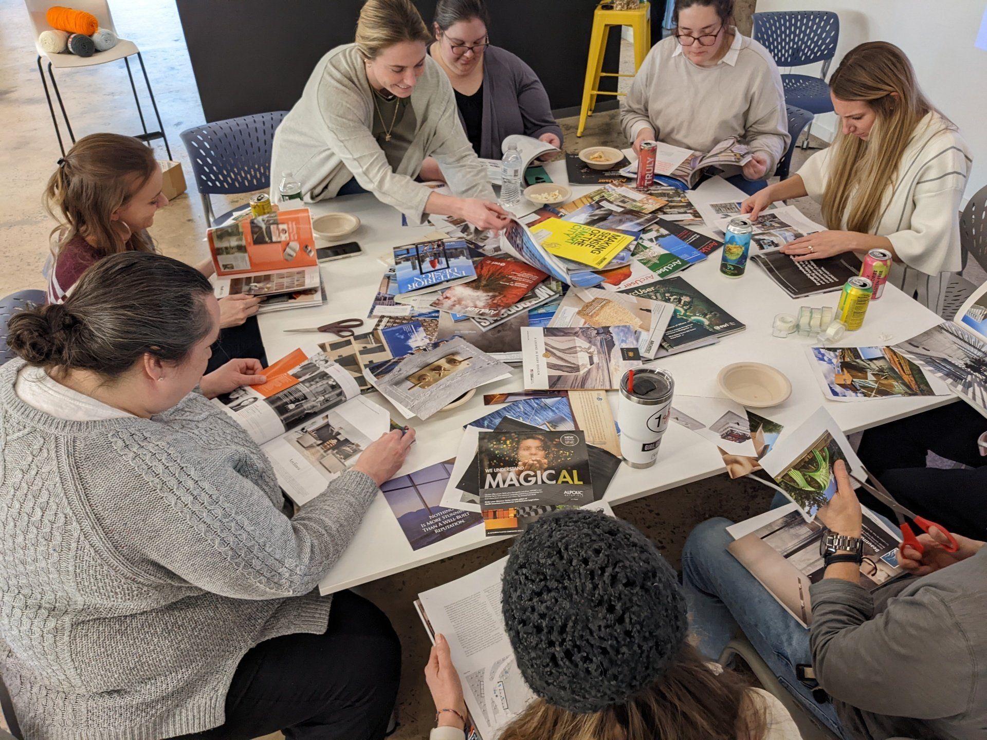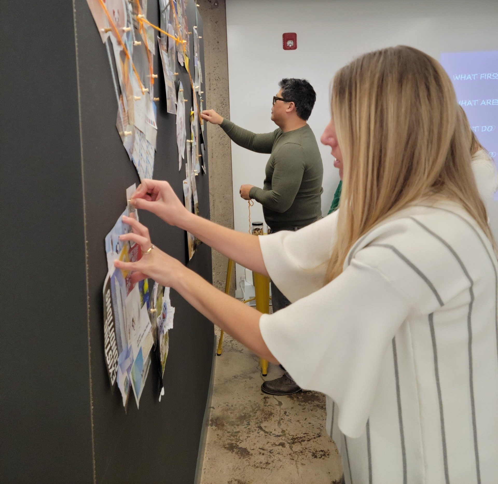 Each person looked through magazines and cut-out or ripped out images and text that spoke to them and created collages to be pinned up on a wall. Once collages were pinned up, each person used pieces of yarn to draw connections between similar topics and imagery. This engaging activity opened up conversations about similar interests across the firm and resulted in a physical installation to energize future sessions.