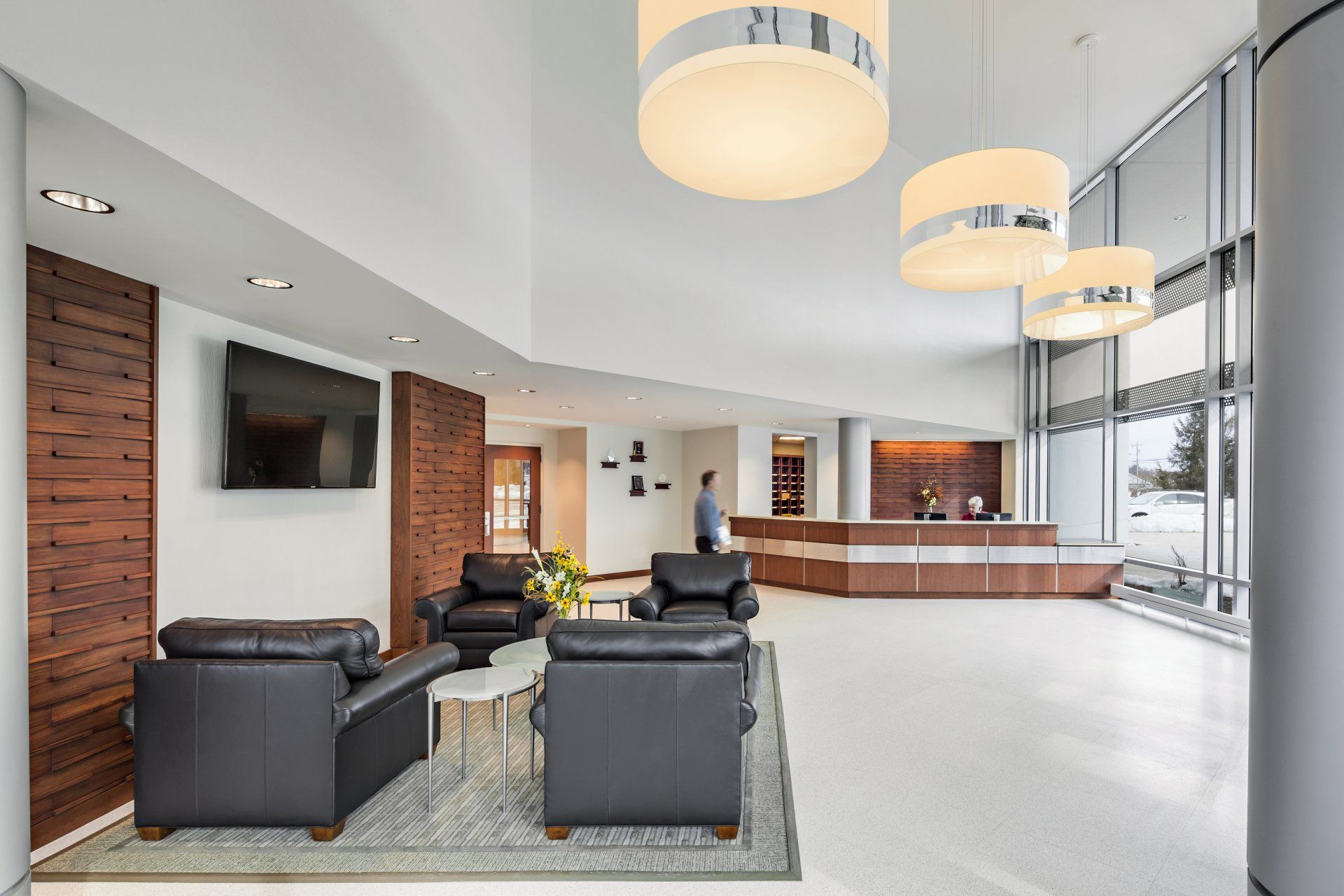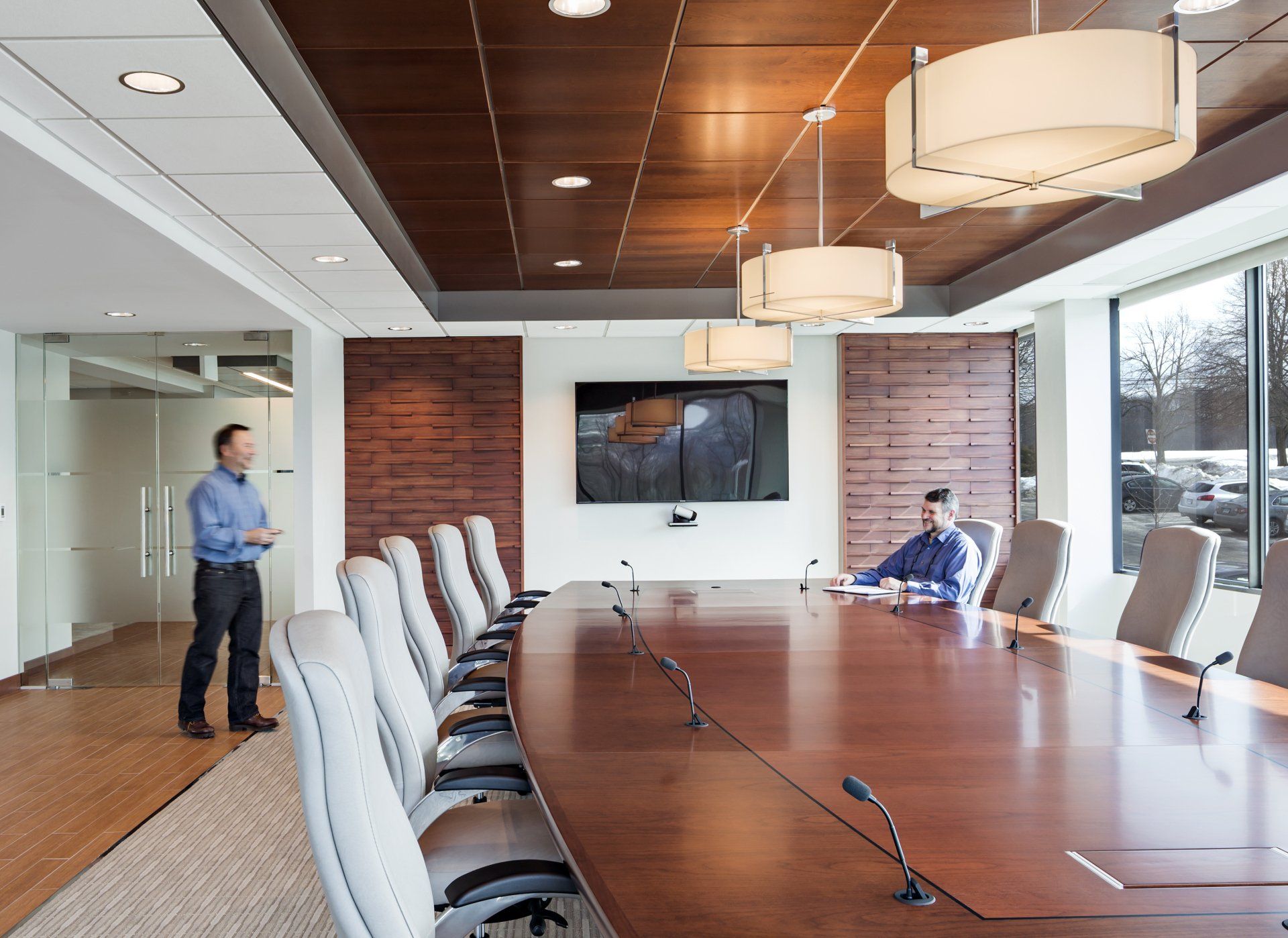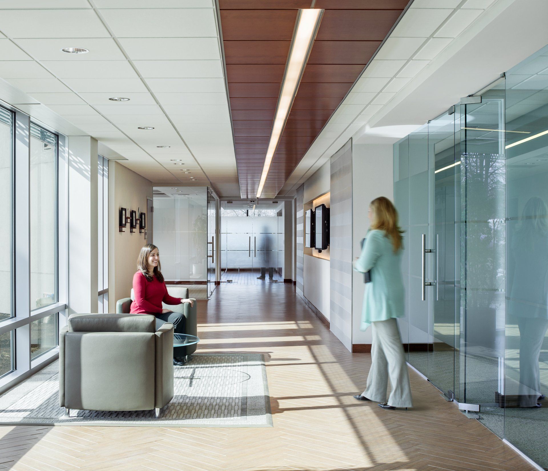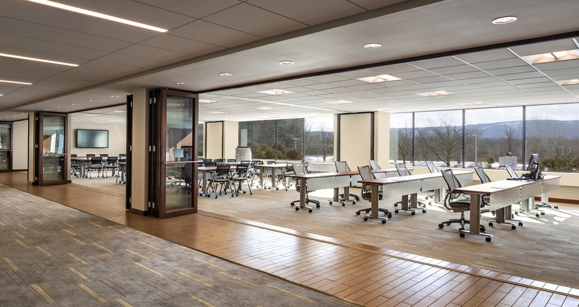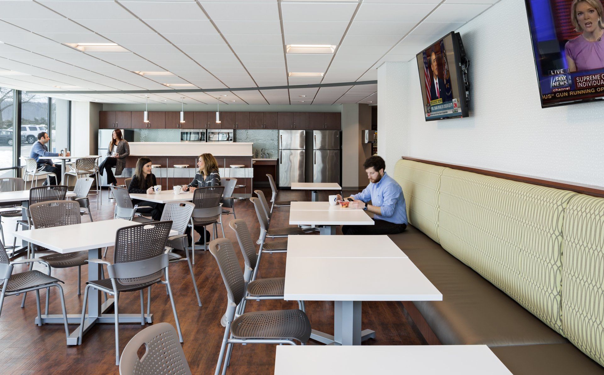 COCC purchased an abandoned office building in Southington with plans to relocate its rapidly expanding workforce from their Avon location. The dilapidated building was completely gutted and renovated to provide a fresh start. Tecton worked with COCC to incorporate their logo and branding colors into the design, to deliver a space that wordlessly conveys the brand. Location of private offices on the exterior walls, coupled with low workstation panel heighs and glass interior walls provide a bright, open environment with exterior views throughout. Sound masking technology and highly absorptive acoustical ceiling tiles maintain a quiet work atmosphere, despite the lower panels. The modern approach to design mimics COCC’s cutting-edge technology products, merged with a traditional clientele.