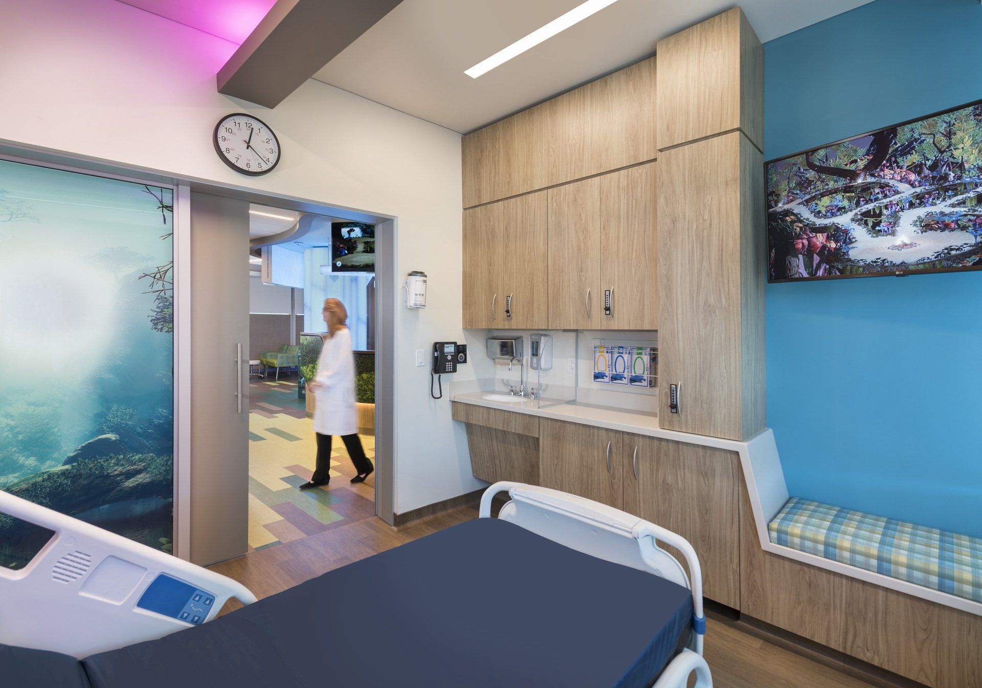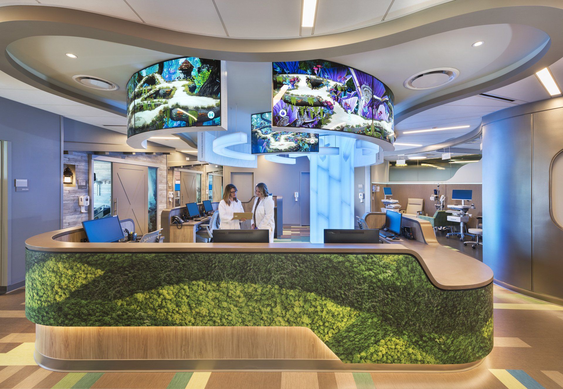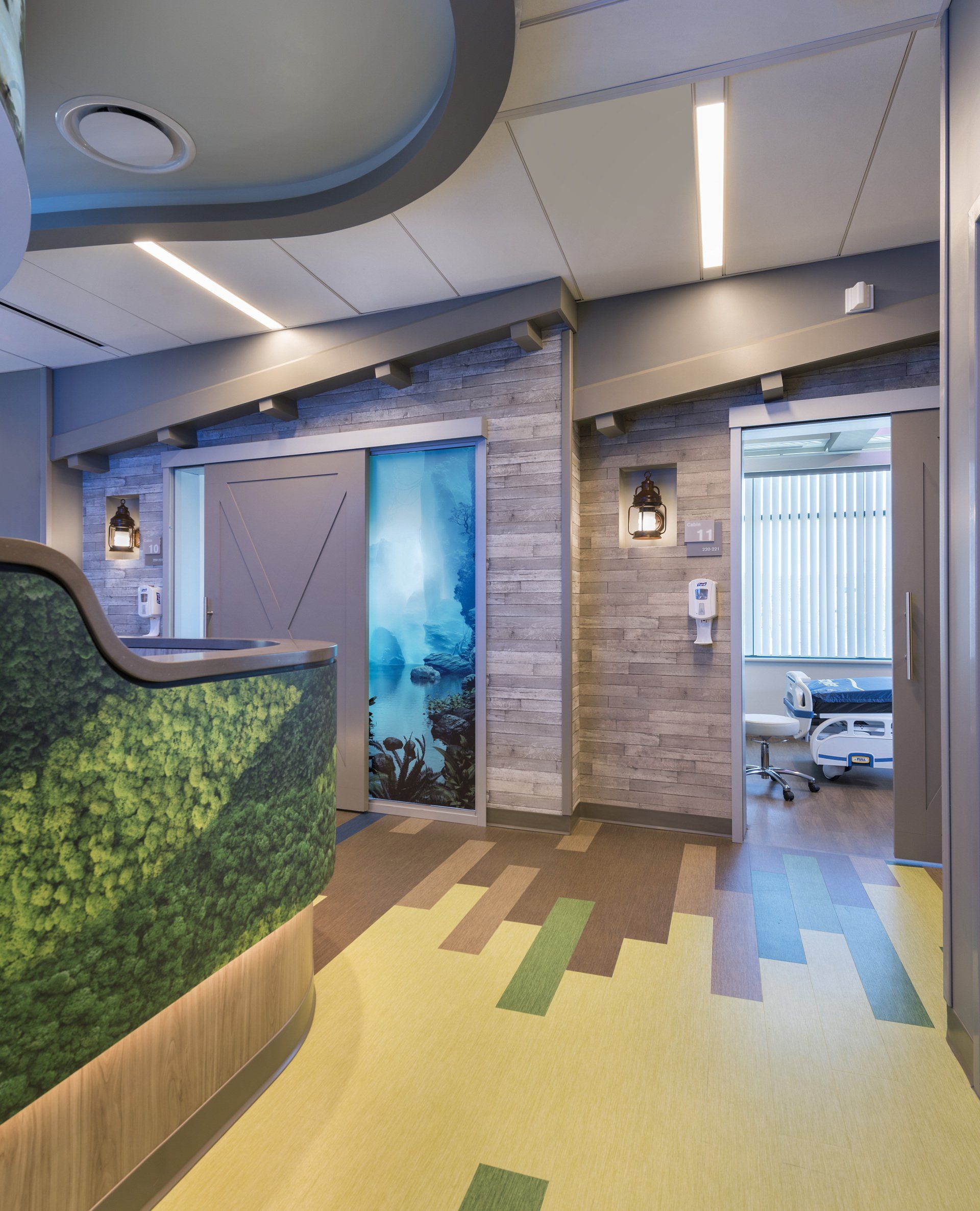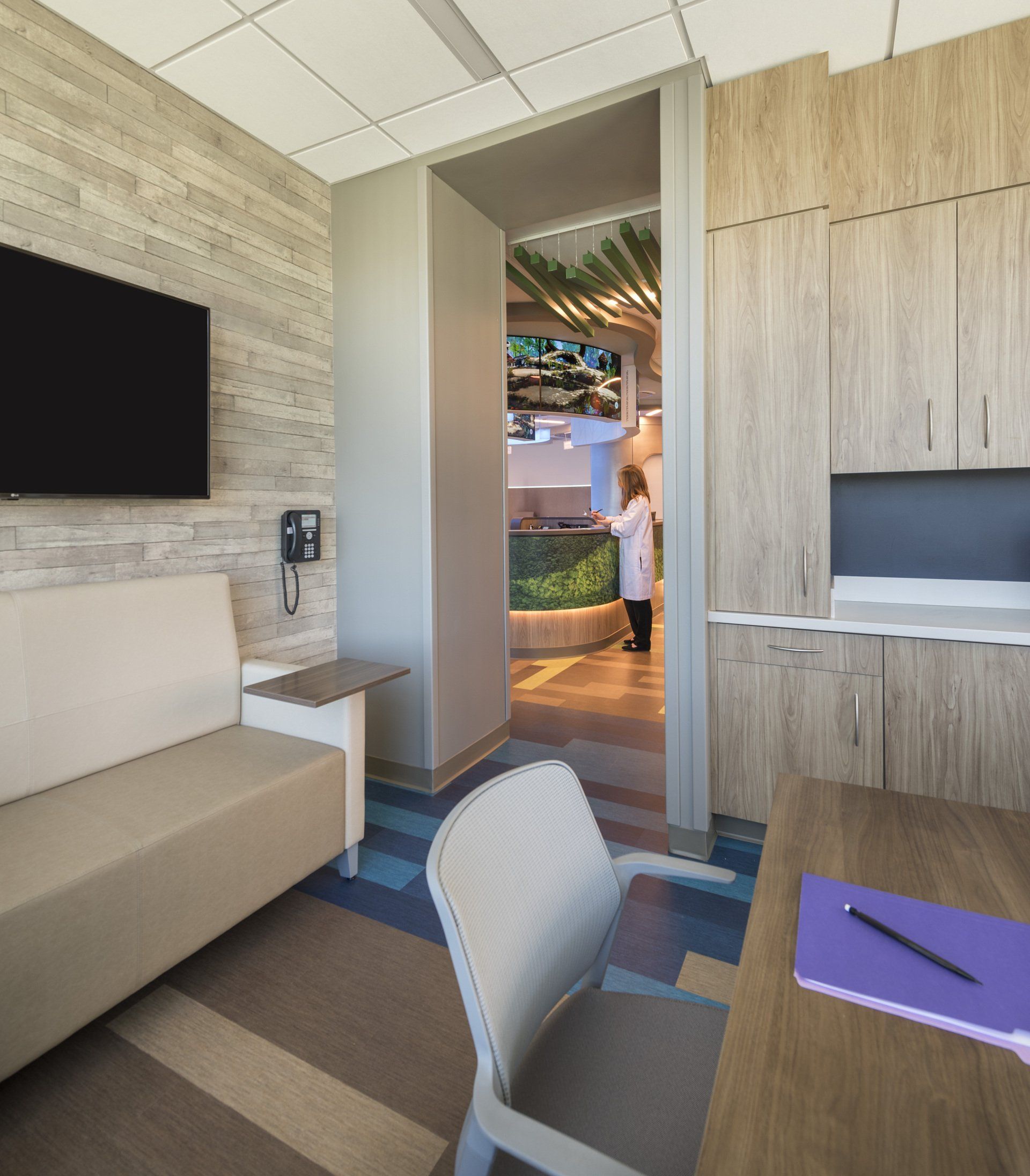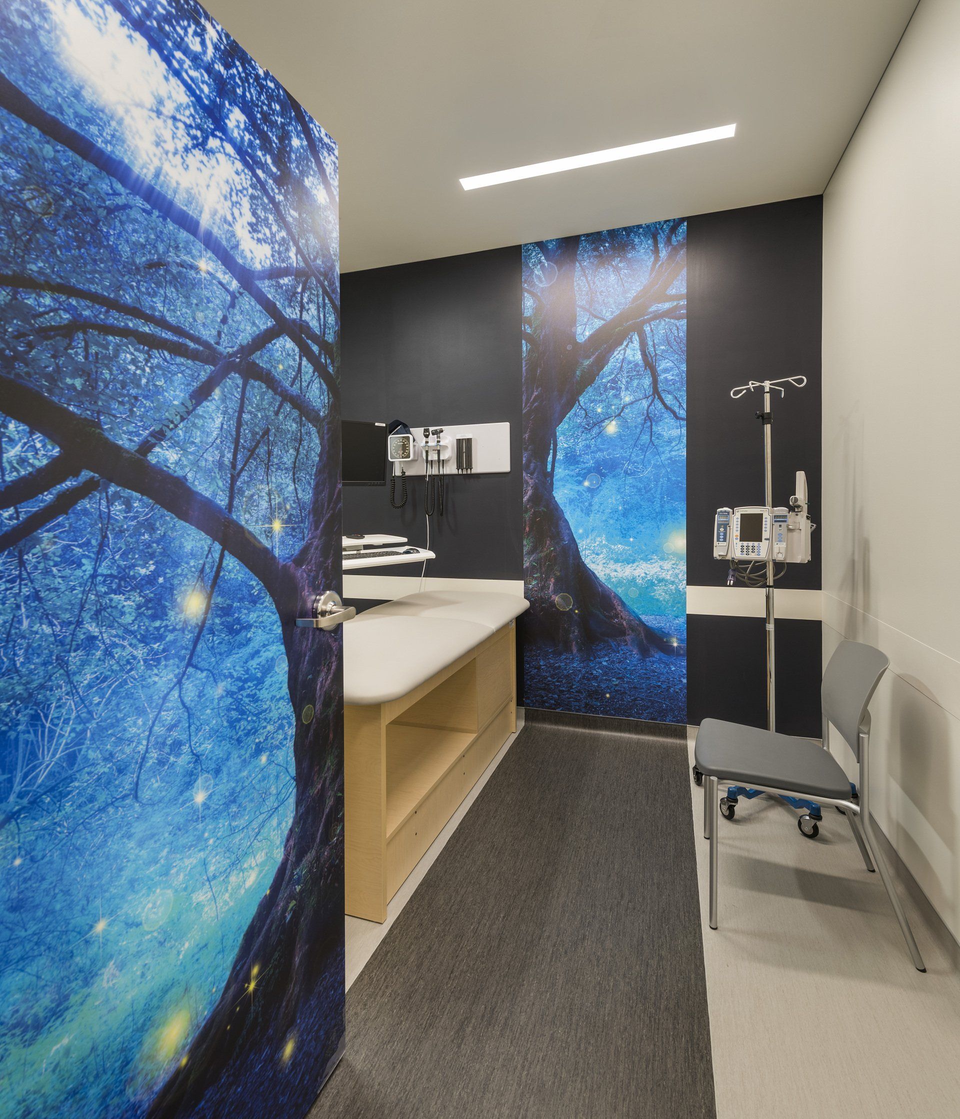 Tecton worked with Connecticut Children’s Medical Center and Dimensional Innovations to transform the healthcare experience at the hospital’s Pediatric Infusion Center. Tecton’s design draws on our team experience in markets like corporate, K-12 and advanced technology, for a playful theme modeled after the natural environment and outdoor activities. Through the creative application of furniture layouts, color palettes, material selections, finishes, specialty lighting and digital media, our collective team was able to deliver a sense of excitement and engagement for children and their families.