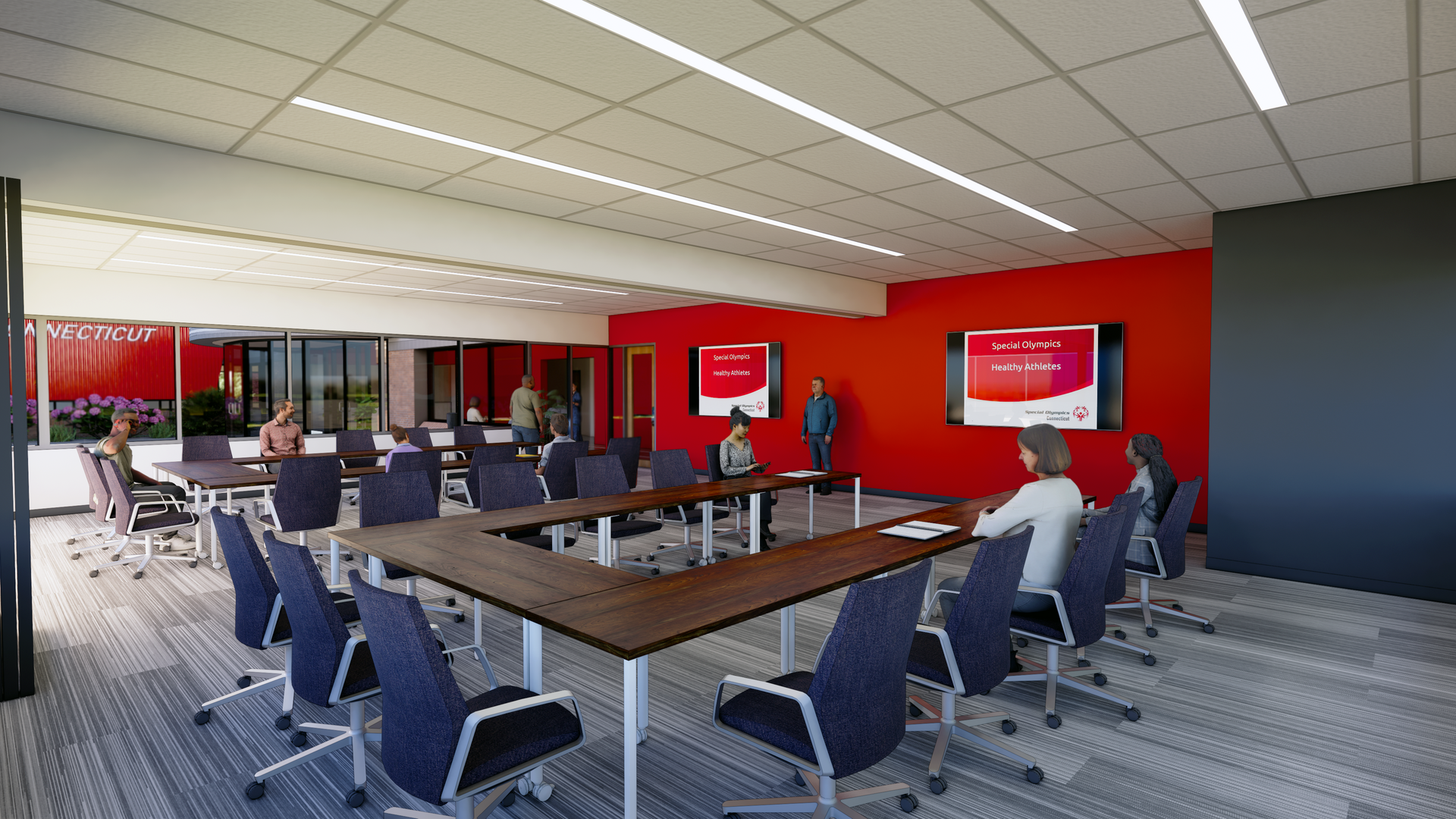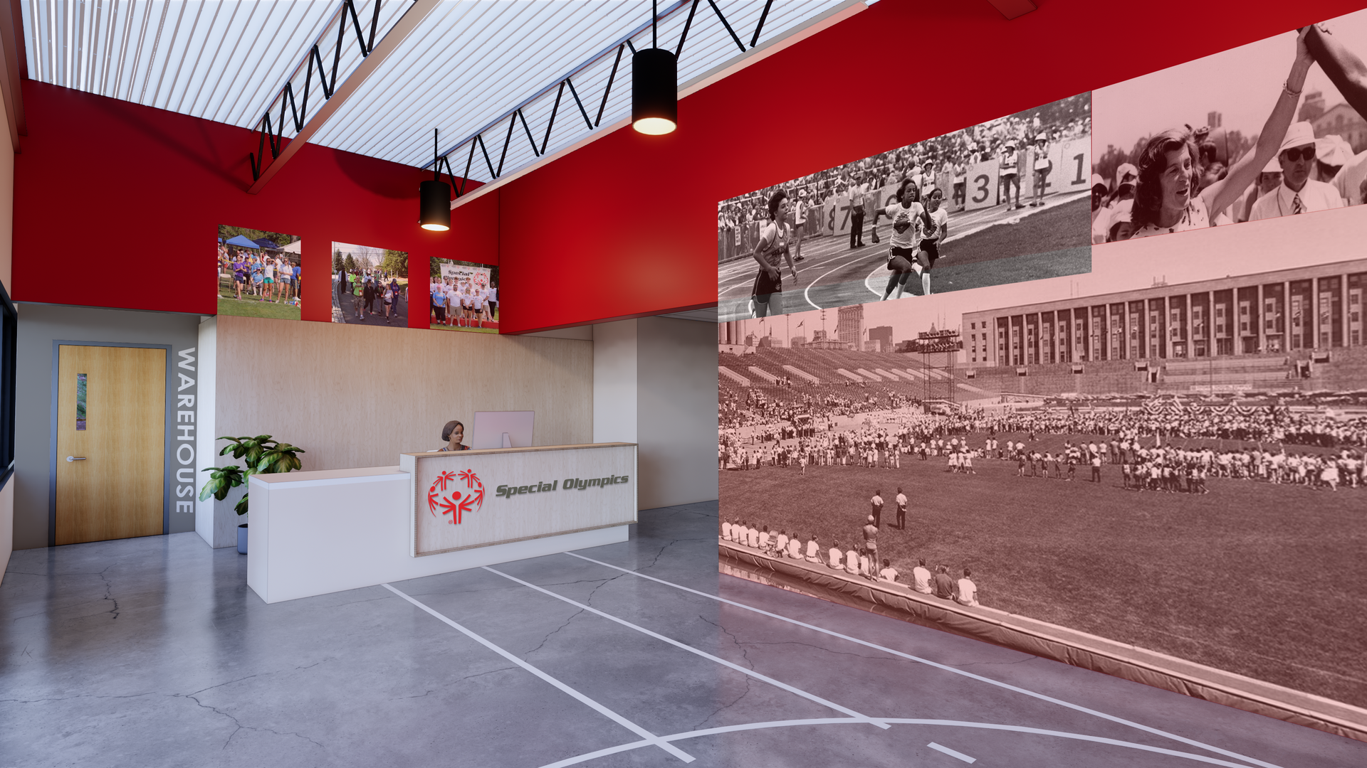 Tecton collaborated with Special Olympics Connecticut and partners to conceptualize a new headquarters that supports event operations and the organization’s daily mission. The design draws on simple materials, bold colors and cost effective construction assemblies to promote their brand in an economical way. To promote collaboration and accommodate year-round public health services and home skills activities, the business functions are organized along a linear core, with flexibility in training rooms, warehouse and circulation spaces to support events and logistics. Flexible meeting and collaboration spaces are carved into the “Honor Wall” that highlights the organization’s history, athletes and partners. Additionally, promoting responsible design and respect for the environment was a key consideration, and the team outlined initial options to maximize daylight and heat recovery, minimize thermal loss, and capture passive cooling and solar heating potential. Our initial conceptual design, graphics, and the project “story” were used to support SOC’s capital campaign.