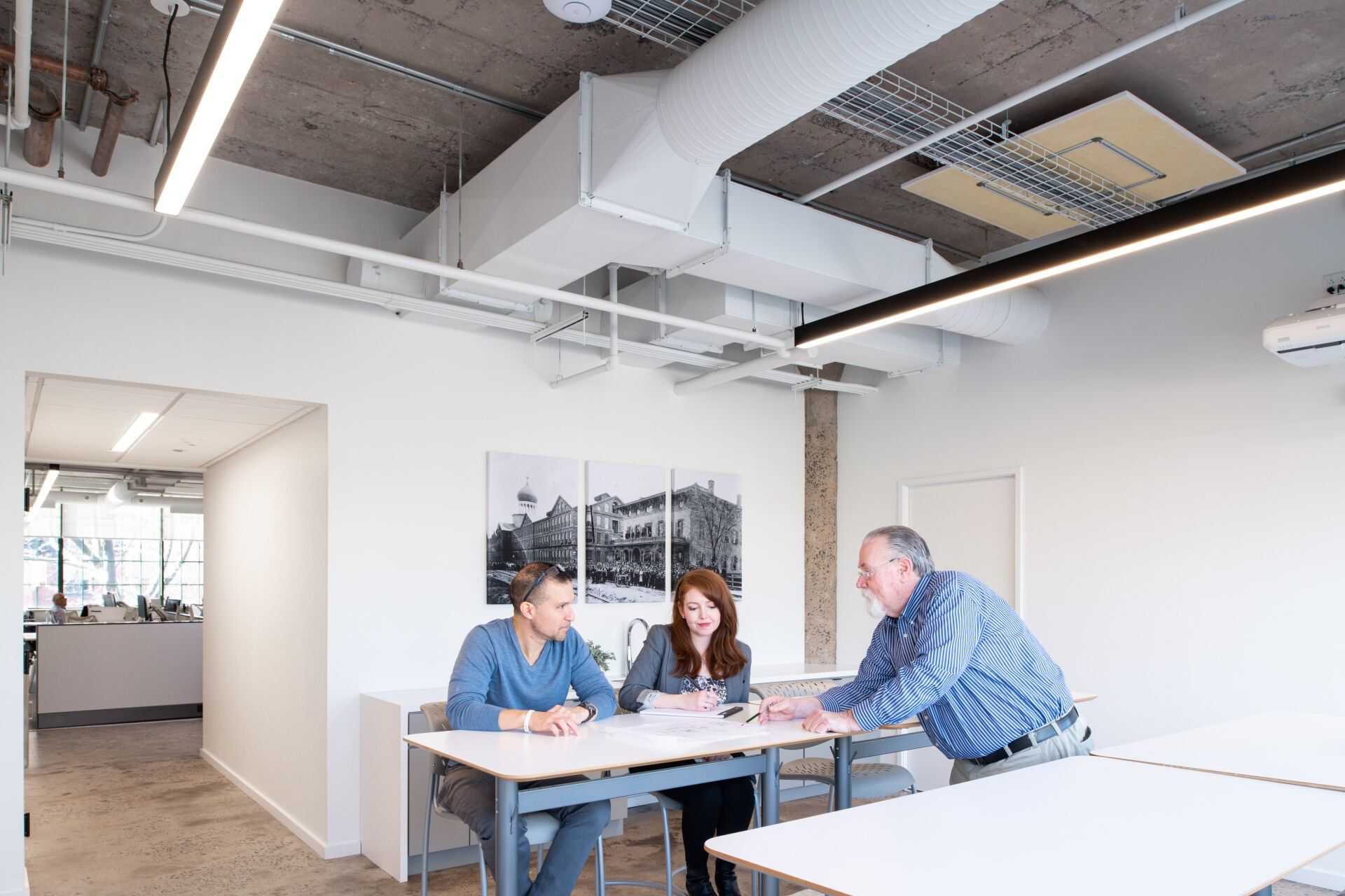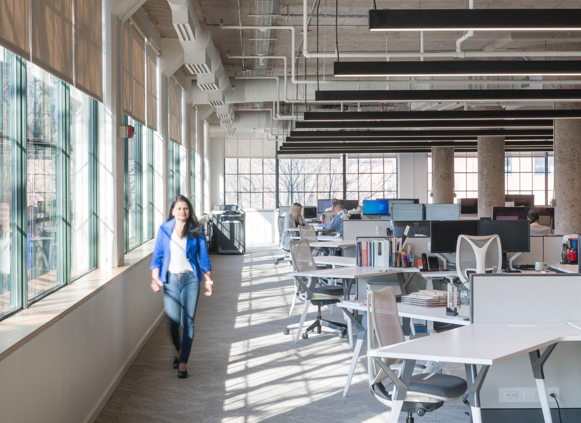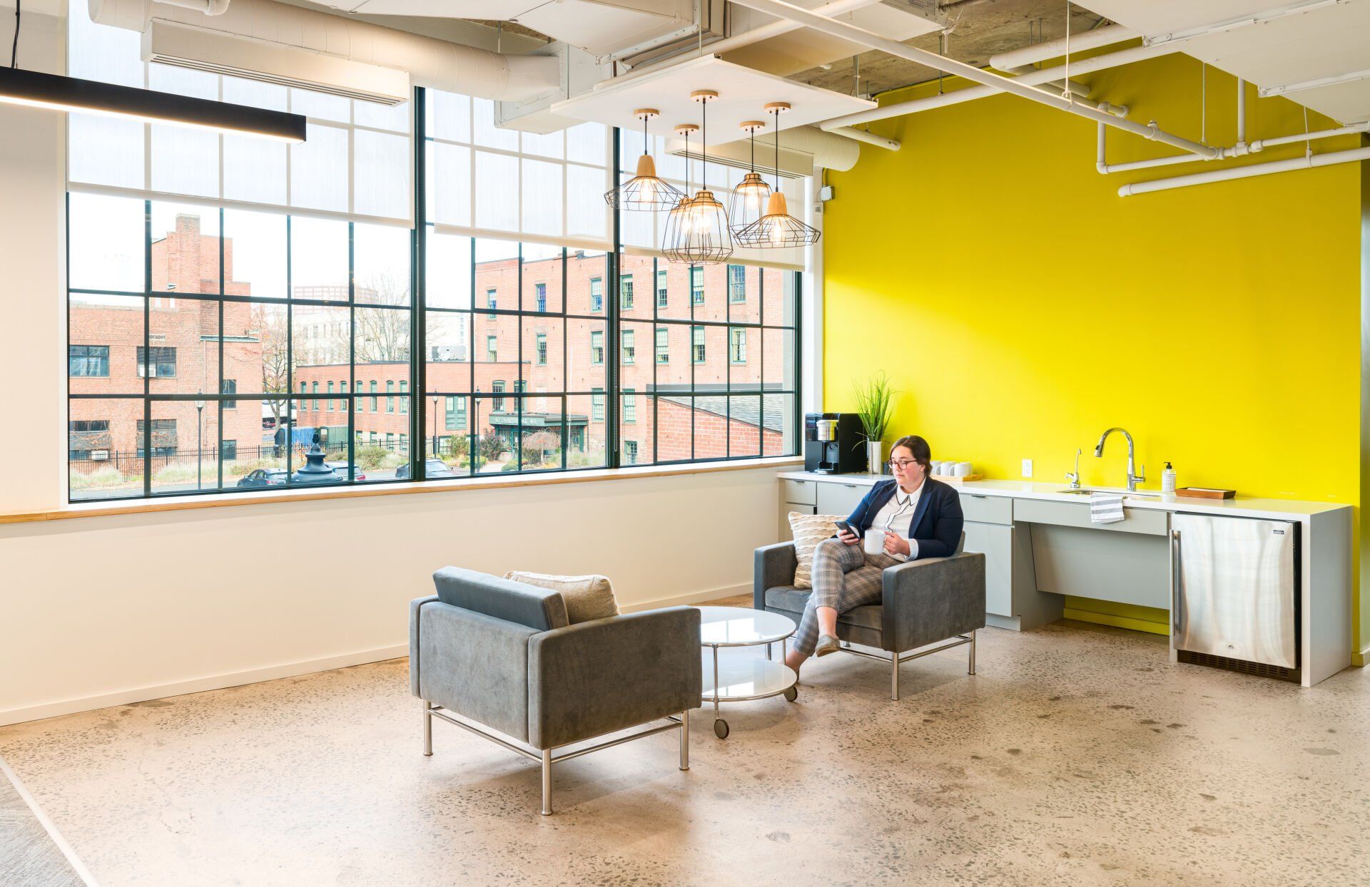 With more than 30 years of history in downtown Hartford, when Tecton began looking to relocate our studio, remaining in the capital city was a priority. After reviewing a number of properties, the firm was drawn to the raw potential afforded by a 12,000 SF space in Hartford’s Coltsville District. Building on an initiative of self-discovery and branding, the team sought to create an environment that reflects the energy, authenticity and working culture of our firm. With its large windows, concrete floors, exposed ceilings and monolithic columns, the space provided a raw, blank canvas. The challenge: designers designing for designers. Working with an experienced and passionate architectural and interiors staff, the core team worked to carefully capture each individual voice, while prioritizing the needs and vision for the firm. The resulting space builds on the manufacturing history of the complex, balancing industrial character with warm finishes and intentional use of color. A large open office supports the firm’s small-teams, hands-on approach to projects, and enhances opportunities for communication and collaboration. A range of informal touchdown spaces, casual gathering areas and formal presentation rooms support on-site meetings, with Colt-inspired identifiers like “The Foundry,” “The Armory” and “The Forge.”