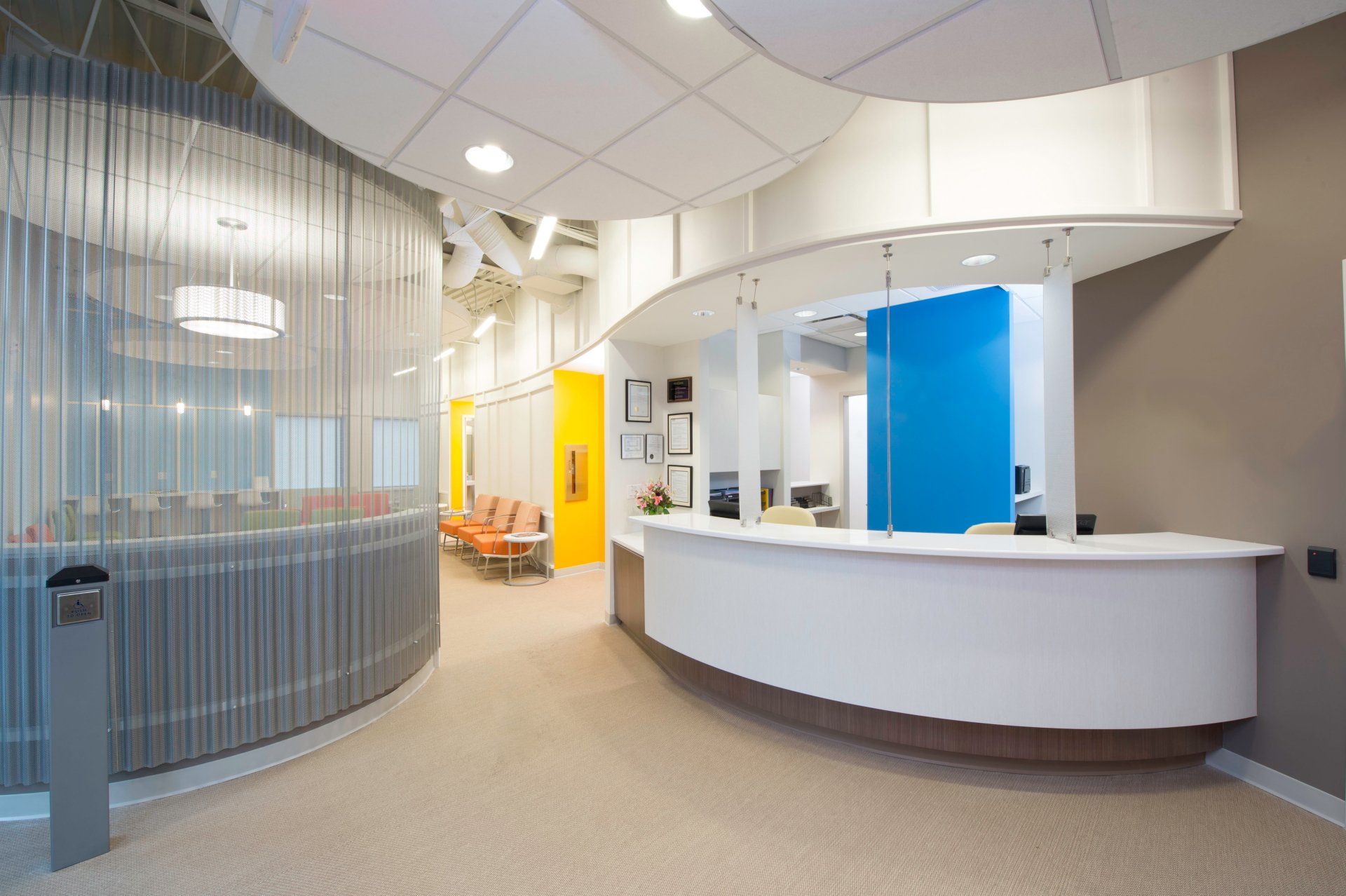 Tecton worked closely with our client as they embarked on a new branding initiative for all of their health centers. The project kicked off with a week-long “3P” event, focusing on the People, Preparation and Process to generate full endorsement of a new clinical working model. Over a dozen doctors, clinicians, senior management and Tecton’s design team attended the event. By informed trial and error, with full-sized cardboard mock-ups of actual work areas, the team discovered how the space could be used most effectively and efficiently. Tecton implemented the layout and design standards developed during this process in the first functional prototype clinic and subsequent locations across New England. The design standards include inviting finishes and furnishings, vibrant color highlights that tie in the client’s brand standards and functional work flows that support staff and patients.